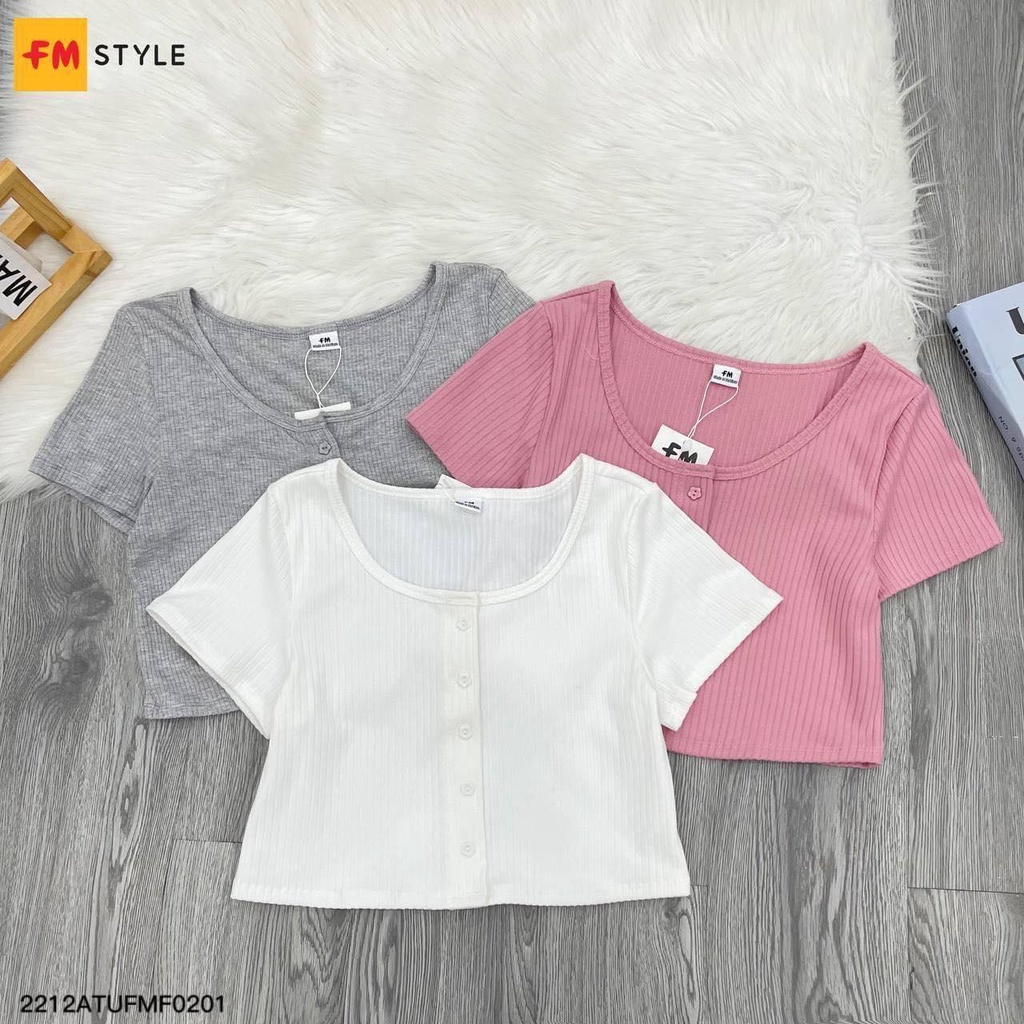 Áo croptop nữ FM STYLE tay ngắn cổ tròn đính nút chất thun cân co giãn mềm mịn thời trang Hàn Quốc 22120045