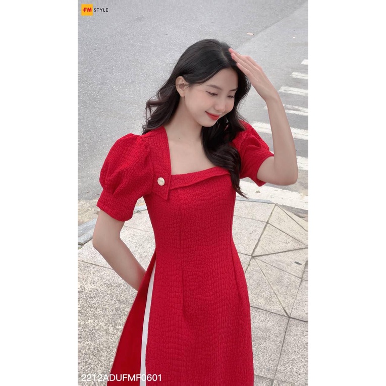 Áo dài cách tân FM Style tay ngắn phồng thiết kế cổ U đính nút chất vải xốp nhăn thời trang truyền thống TẾT 22120206