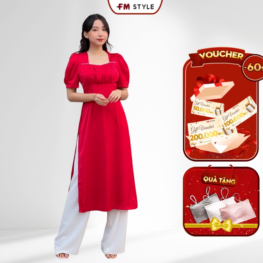 Áo dài nữ cách tân FM Style màu đỏ cổ vuông nhún ngực tay ngắn đính ngọc thời trang lễ TẾT sang trọng 22120454