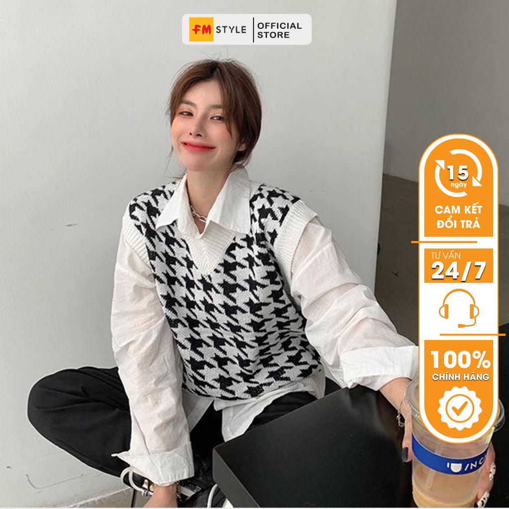 Áo gile nữ FM Style form rộng hoạ tiết caro cổ tim chất len dày dặn thời trang thu đông phong cách hàn quốc 211015210