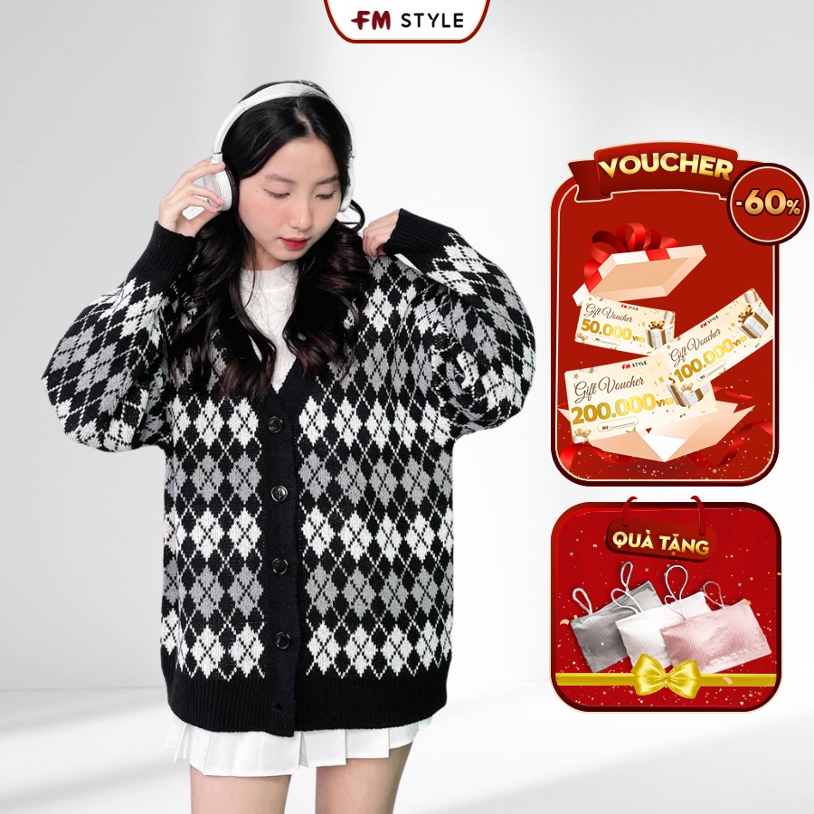 Áo khoác len cardigan nữ FM Style thiết kế cổ v phối hoạ tiết hình thoi nhiều màu sắc thời trang ulzzang 206240084