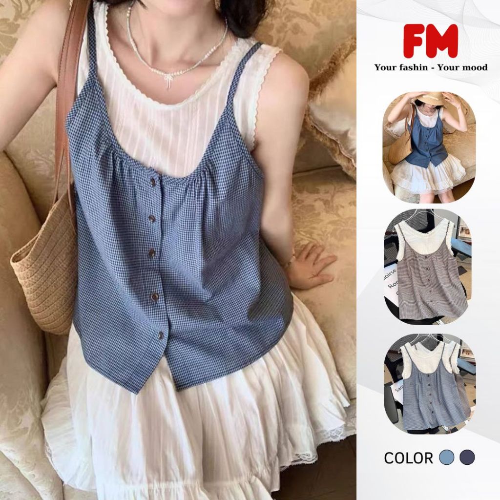 Áo kiểu hai dây caro phối ren – sự kết hợp độc đáo giữa họa tiết caro cổ điển và ren mềm mại. Thiết kế trẻ trung, nữ tính, dễ dàng mix & match.