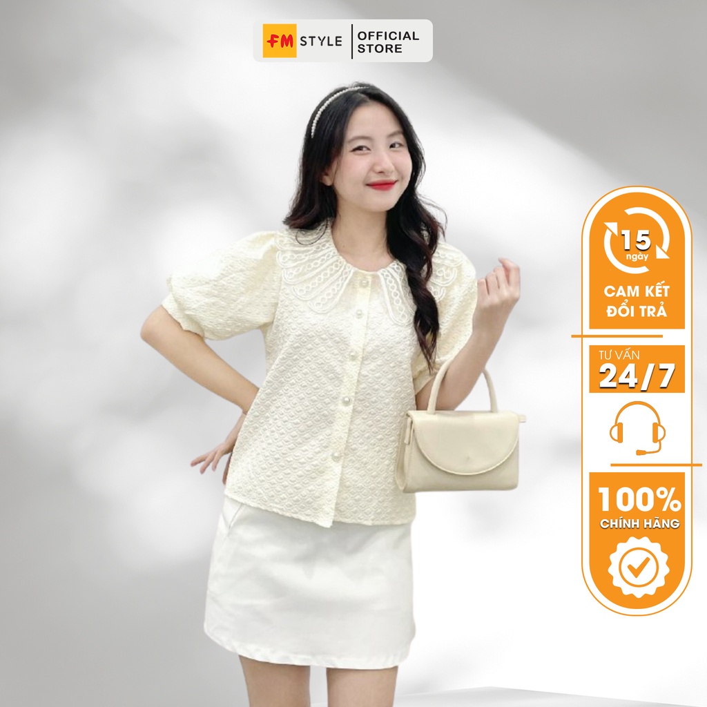 Áo kiểu nữ FM Style cổ tròn phối ren tay phồng nút ngọc chất liệu vải xốp dập nổi thời trang bánh bèo Hàn Quốc 208100023