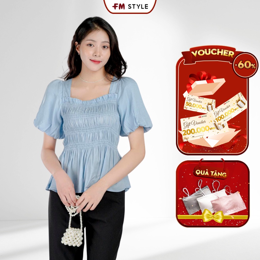 Áo kiểu nữ FM Style cổ U nhún thun ngực tay phồng thiết kế thắt dây lưng thời trang phong cách Hàn Quốc 209120031