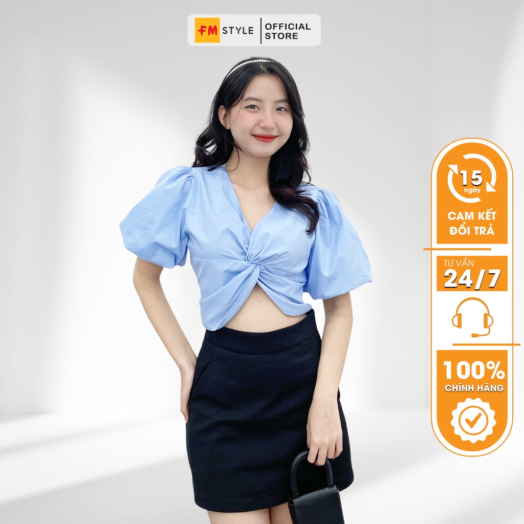 Áo kiểu nữ Fm Style thiết kế cổ v xoắn nơ ngực tay phồng thời trang dễ thương phong cách Hàn Quốc 208230012