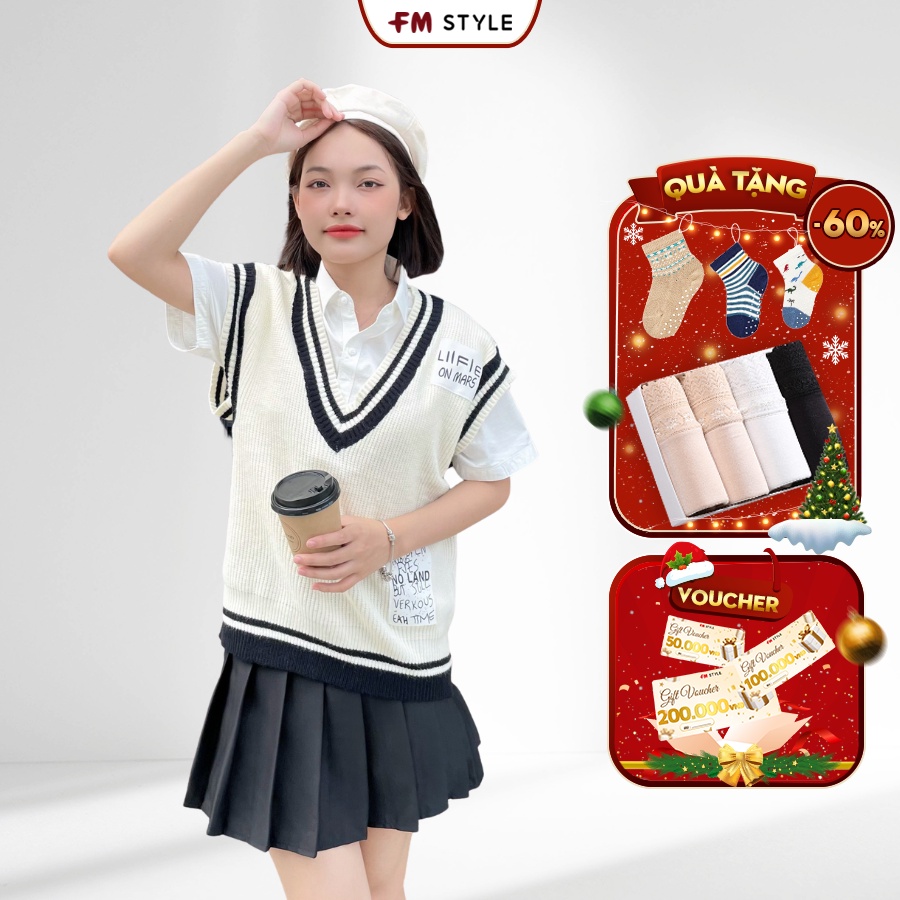 Áo len nữ cổ tim FM Style ghile phối viền kẻ ngang in logo chất len dệt kim thời trang phong cách Hàn Quốc 208170036