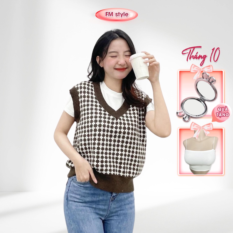 Áo len nữ FM Style cổ tim kẻ ô nhỏ nối liền chất len tăm mềm mịn hàng thiết kế thời trang Hàn Quốc 207190088