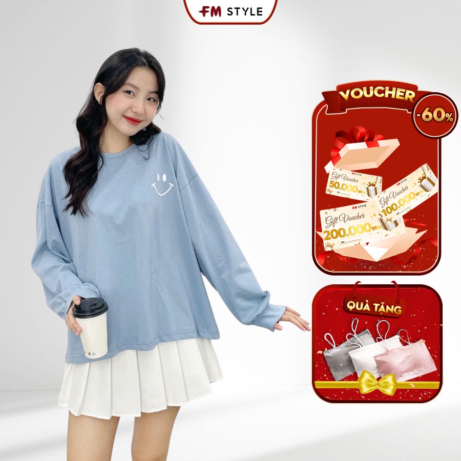 Áo phông nữ form rộng Fm Style tay dài cổ tròn in hình mặt cười nhiều màu sắc thời trang ulzzang 209300024