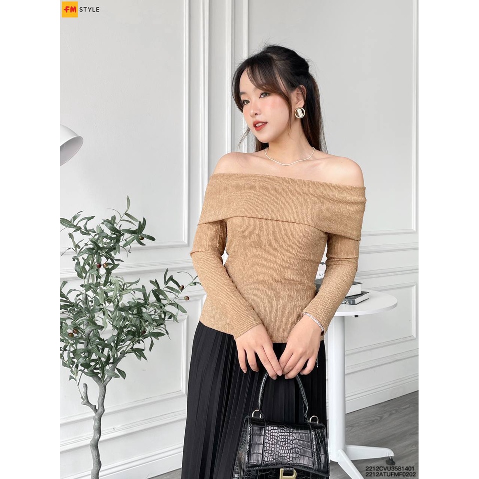 Áo trễ vai FM Style nữ thiết kế tay dài bẹt vai chất vải nhũ nhăn co giãn thời trang tiểu thư Hàn Quốc 22120064