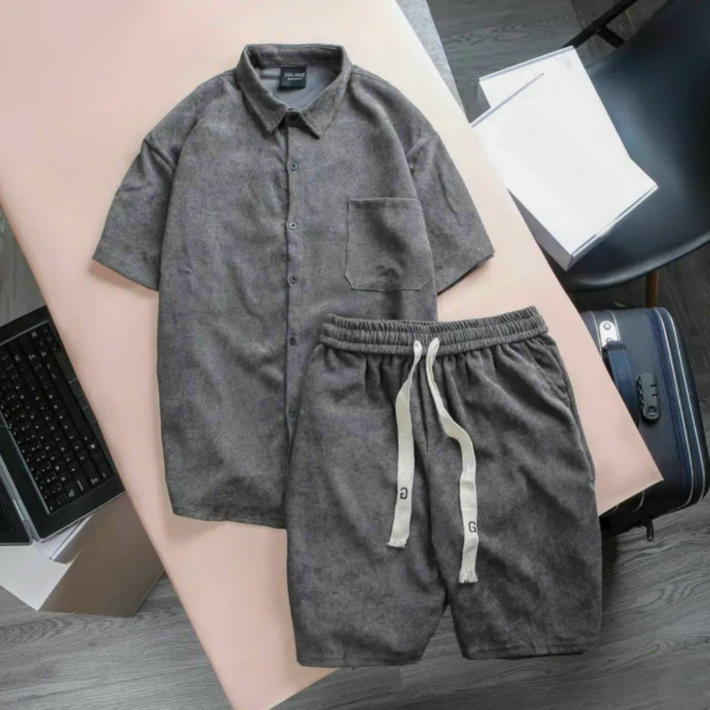Bộ sơ mi nhung tăm cộc tay nam có túi ngực unisex