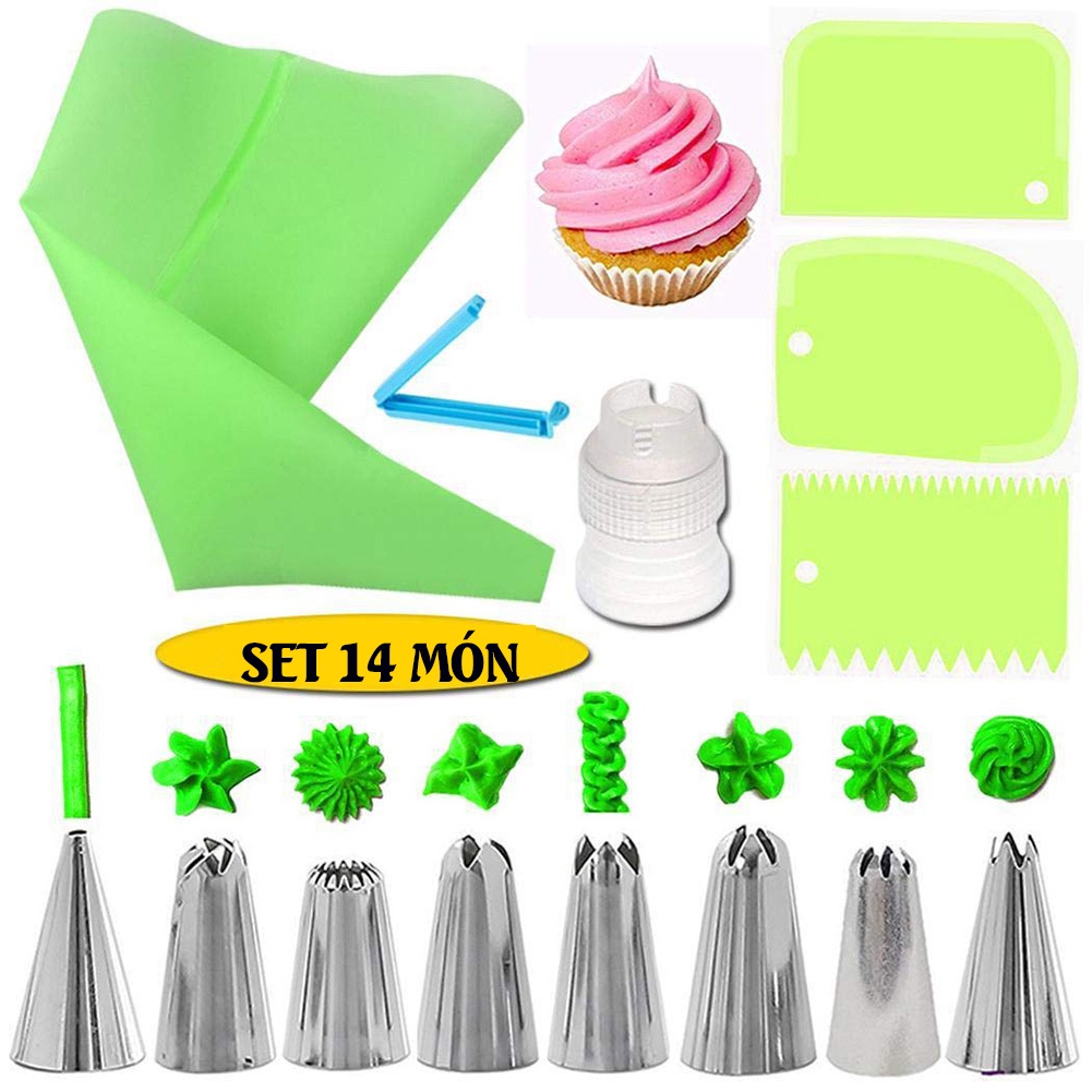 Dụng Cụ làm Bánh Bộ 14 Miếng -Bộ Túi Và Đui Bắt Bông Kem Bằng Thép Không Gỉ Trang Trí Bánh DIY