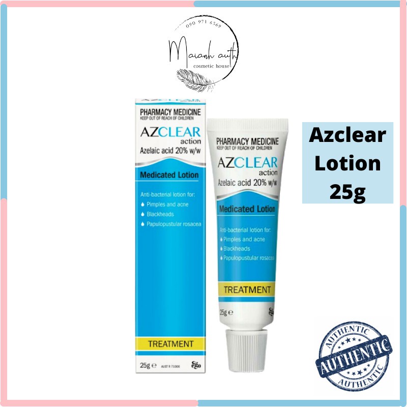 MÔ TẢ SẢN PHẨMKEM AZCLEAR ACTION LOTIONĐây là sản phẩm nổi bật của hãng Ego – nổi tiếng của úc, dạng kem lotion lỏng, màu trắng, mùi thơm nhẹ Tác dụng _ Rất hiệu quả, chỉ cần thoa 1 lớp mỏng lên nốt, hôm sau sẽ đóng vảy hoặc lên nhân trắng (nếu là trứng cá) và bong tróc_Công thức Duol – action giúp, giảm bít tắc lỗ chân lông khiến làn da trở nên thông thoáng, giảm mẩn đỏ và làm khô nhanh chóng những nốt trứng cá_Cung cấp độ ẩm cho da giúp da săn chắc-Kem đa năng vừa làm lành ở mức mạnh vừa giảm viêm và đỏ da (Rosacea); giảm thâm hoặc tăng sắc tố.LOẠI DA:Tất cả. Đặc biệt hợp da thâm, tàn nhang, da nhạy cảm, chứng đỏ da (Rosacea).HDSD:Dùng không quá 2 lần/ngày: tối và/hoặc sáng tùy theo mức dung nạp của da. Ban đầu nếu da chưa quen nên dùng từ 2-3 lần/tuần vào buổi tối và tăng dần đều tần suất sử dụng lên hàng ngày. Dùng sau bước serum, trước kem/dầu dưỡng ẩm. Mỗi lần dùng tầm 0.2g-0.5g cho toàn mặt hoặc ít hơn nếu chỉ bôi lên từng vùng nhỏ. Thường bắt đầu có tác dụng trong 1-2 tháng nhưng nên dùng đều đặn kéo dài hơn 2 tháng để đạt kết quả tối ưu.LƯU Ý:+ Một số người có thể có cảm giác ngứa, châm chích khi mới dùng. Cảm giác này sẽ hết khi da quen dần với Azelaic Acid+ Có thể hơi vón cục không đáng kể với 1 số người+ Có thể đẩy mụn 1 thời gian với 1 số người#azelaic #kemgiammun #giammun #giamtham #giammun