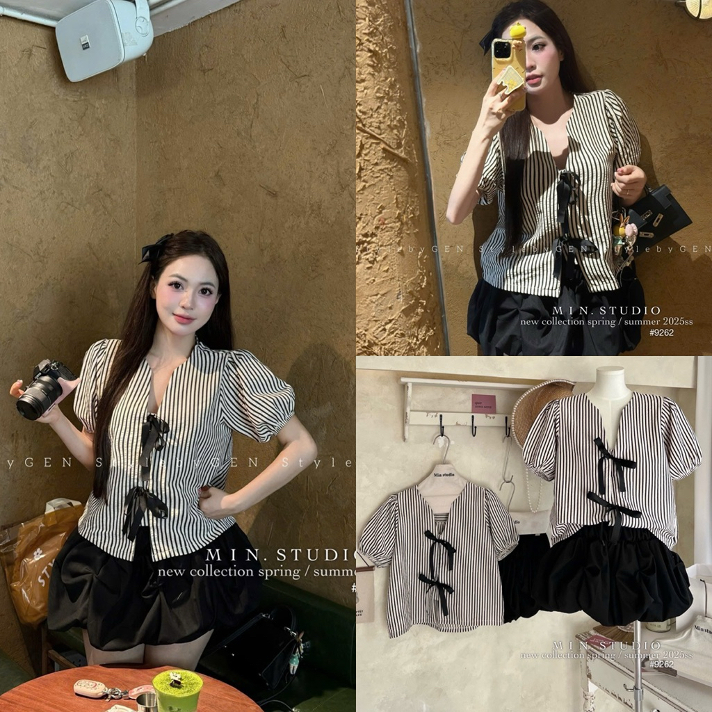 🔹Áo sọc tay bồng thắt nơ:Chất liệu: Cotton blend (cotton pha polyester/linen nhẹ)