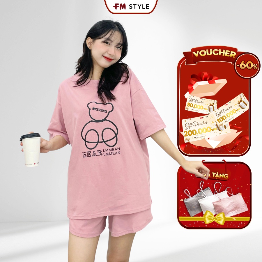 Set đồ bộ nữ FM Style áo thun tay ngắn cổ tròn in hình gấu kèm quần đùi rút dây ống rộng thời trang mặc nhà 207140055