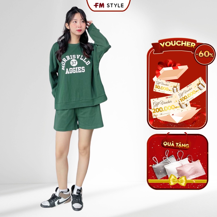 Set đồ bộ nữ FM Style quần đùi kèm áo thun tay dài in hình chữ chất cotton mềm co giãn thời trang mặc nhà 210170008