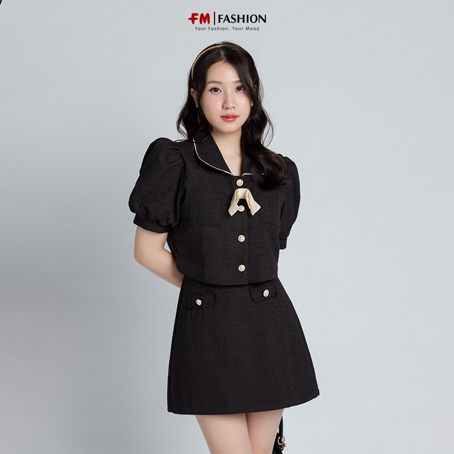 Set đồ nữ FM STYLE áo kiểu nữ tay ngắn bồng cổ bẻ thắt nơ phối túi kèm chân váy ngắn thời trang thiết kế 23010490