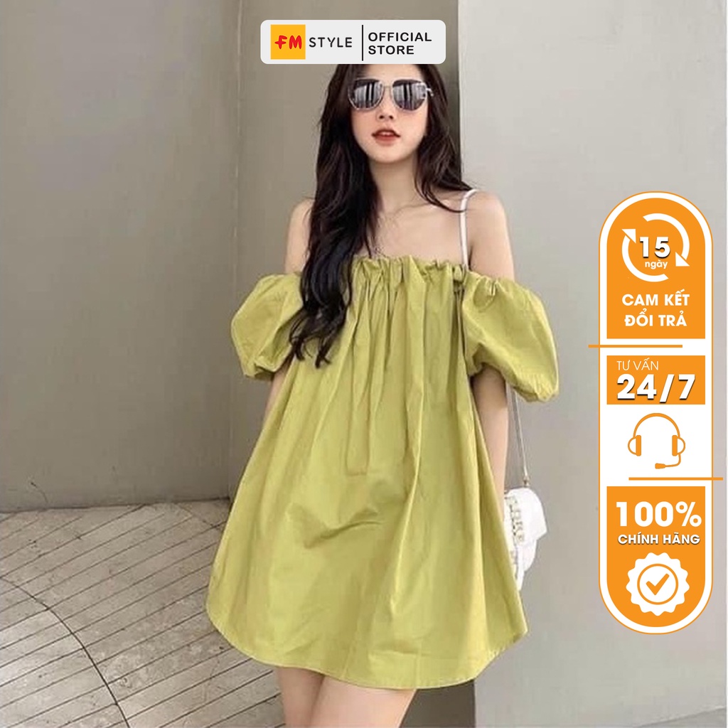 Váy trễ vai tiểu thư FM Style kèm dây nịt thắt eo from rông dáng ngắn hot trend phong cách sexy thời trang 220322058